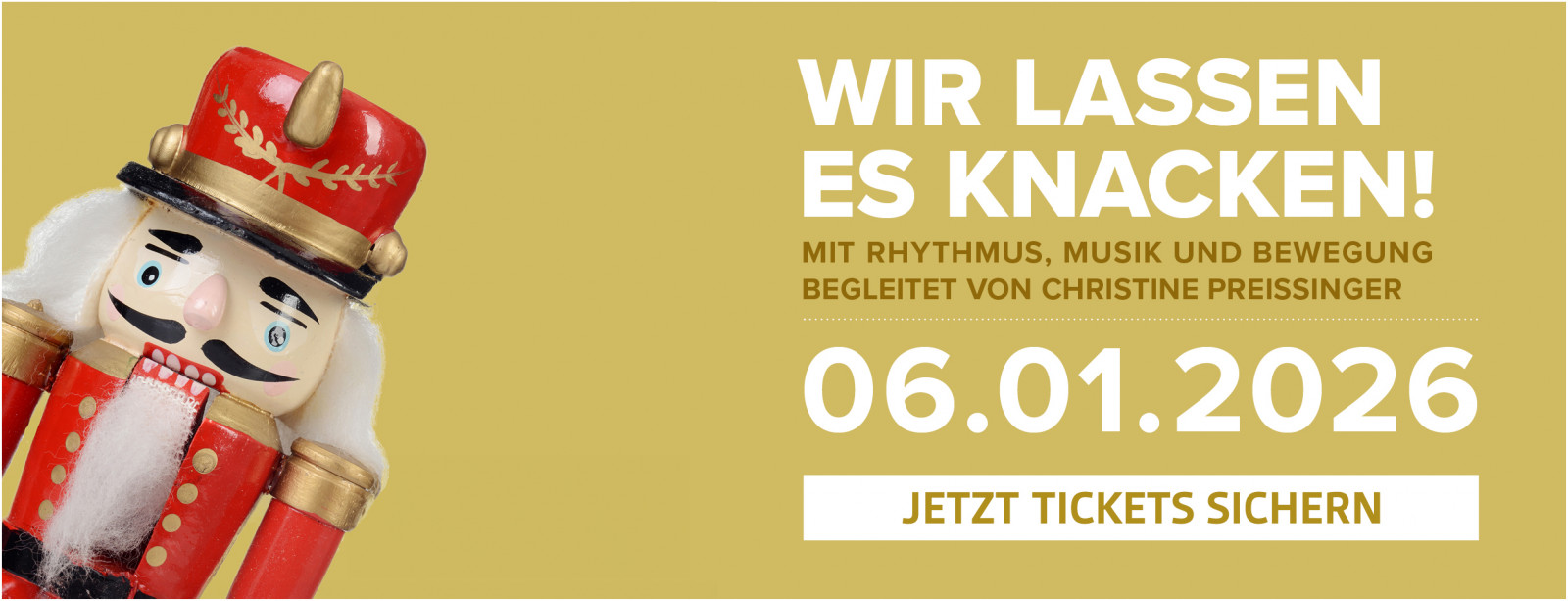 Liebe Familien, am 06.01.2026 erzählt Euch unsere Musikfee Christine Preißinger die Geschichte vom Nussknacker,führt Euch ins Land der Zuckerfee und besiegt mit Euch und dem Nussknacker den bösen Mäusekönig.Es wird gemeinsam gesungen, geklatscht, gespielt und im Rhythmus mit dem Nussknacker marschiert.Bringt Eure Nussknacker mit!Nussknacker jeder Art – groß und klein, ob als Figur oder Werkzeug – sind herzlich willkommen!