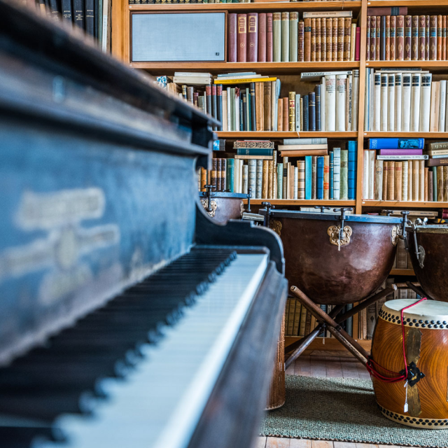 Hier verbrachte Orff fast den ganzen Tag, hielt Besprechungen ab, experimentierte mit Instrumenten und Klängen. All seine Werkskizzen hatte er in der Schublade seines Sofas verstaut. Seine umfangreiche Bibliothek gibt Aufschluss über seine vielfältigen Interessen – sie öffnet den Blick in Carl Orffs Kosmos: von der griechischen Antike über Märchen und Musik aus allen Zeiten und Ländern bis zur bayerischen Zither.